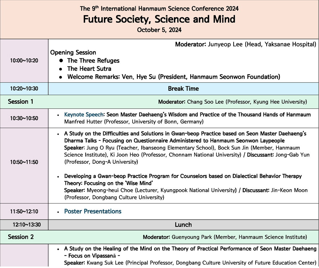 Daehaeng. The conference will feature five papers on the theme “Future Society, Science, and Mind.” Thank you to all the presenters, discussants, and moderators.